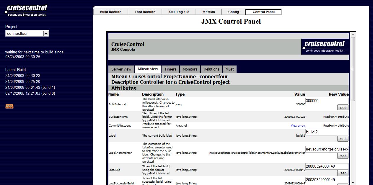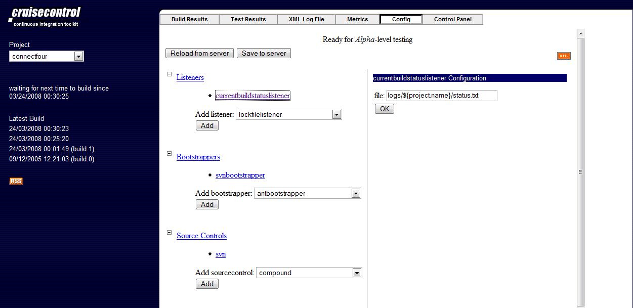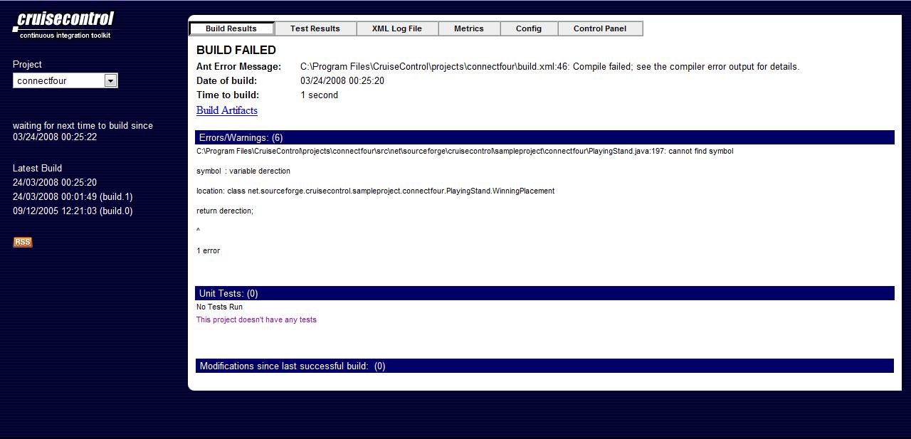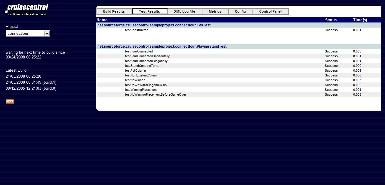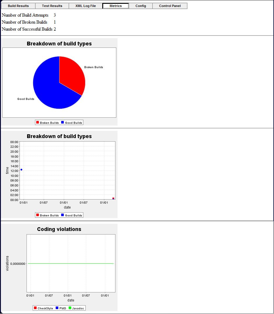 La page XML Log File (non présenté ici) donne accès au log XML de la compilation. On y retrouve l'ensemble des résultats. La page Metrics quant à elle donne des statistiques de compilations sous forme de plusieurs graphiques représentant le pourcentage de compilation réussies ou échouées, les données de Checkstyle, etc.