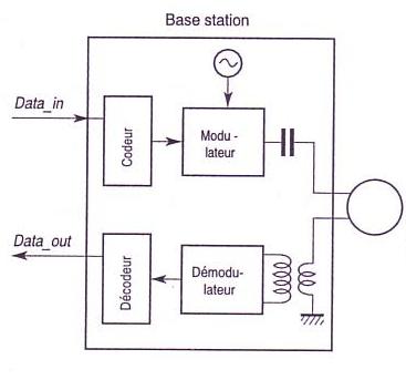 Ce schéma présente globalement les modules fonctionnels qui composent une station de base. Un lecteur est tout d'abord équipé d'une interface, qui n'apparaît pas ici, avec le système hôte. Comme on peut le constater, il est ensuite constitué d'un microprocesseur qui permet de réaliser les calculs et effectuer les opérations nécessaires. Ce microprocesseur est interfacé avec la partie analogique (partie RF) qui assure la réception et l'émission des signaux radio-fréquence. Le lecteur intègre également tous les circuits de gestion du protocole de communication et de la communication (comprenant les mécanismes d'anticollision, d'authentification et de cryptographie s'ils existent).