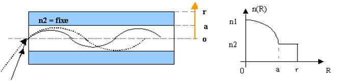 Remarque : Dans le cas de l'approximation plane, la trajectoire d'un rayon lumineux dans le guide est une sinusoïde. Dans le cas de la fibre optique (guide d'onde spatial), la trajectoire du rayon lumineux n'est plus une sinusoïde mais une hélice
