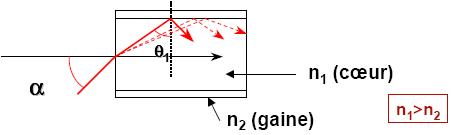 Pour que la lumière soit guidée dans le cœur de la fibre il faut que la condition de réflexion totale interne soit respectée, c'est à dire :