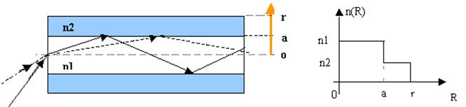 Le guidage de la lumière dans le cœur ne pourra se faire que si l'indice de réfraction du cœur est supérieur à celui de la gaine. Tous les rayons arrivant sur l'interface cœur-gaine avec un angle d'incidence j plus grand que jc de réflexion totale se propageront dans le cœur par suite de multiples réflexion.