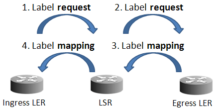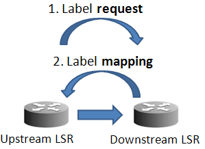 Avec ce mode de distribution, le UpStream LSR demande au DownStream LSR de lui fournir le numéro de label qu'il a associé à une FEC particulière. Le UpStream LSR est le routeur qui envoit le trafic vers le DownStream LSR, ainsi lors du passage d'un paquet qui n'est pas encore associé à une FEC, le UpStream LSR va devoir demander l'association d'un label pour cette FEC au LSR suivant (le DownStream LSR sur ce schéma).