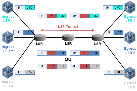 Le schéma ci-dessus montre un réseau IP/MPLS contenant 3 Ingress LER, 3 LSR et 3 Egress LER. Trois LSP sont mis en place :