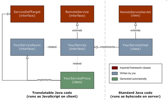 : une interface synchrone du service, extension de RemoteService (côté client), qui est implémentée parYourServiceImpl