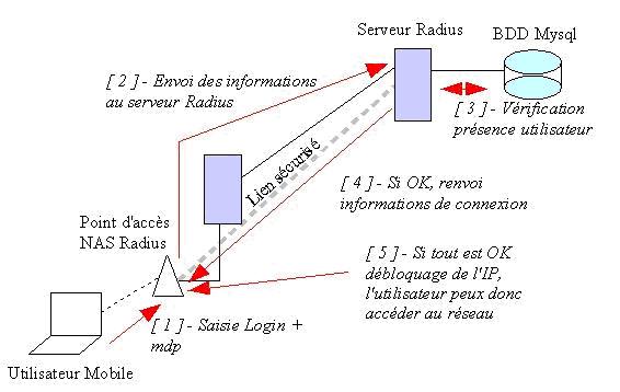 Le protocole RADIUS permet de faire la liaison entre des besoins d’identification et une base d’utilisateurs en assurant le transport des données d’authentification de façon normalisée. Enfin, le client final qui se connecte au réseau envoie tout simplement sa demande au point d'accès. Il n'échange aucune donnée avec le serveur radius. Il envoie juste son identifiant et son mot de passe sur le réseau qui est relayé jusqu'au serveur.