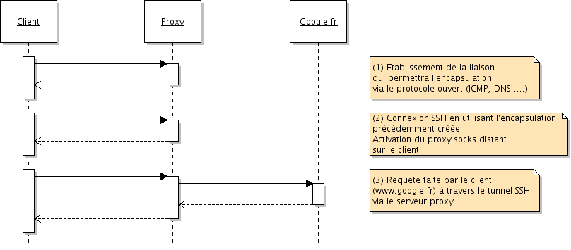 Par exemple, le serveur pourra utiliser des services proxy afin d'assurer le relais entre notre machine et Internet. Pour faire proxy, le serveur devra utiliser un service comme SSH (avec proxy socks), SQUID .... Ainsi, la connexion au hotspot initialement bloquée pourra être contournée par l'un de ces services nouvellement installés.