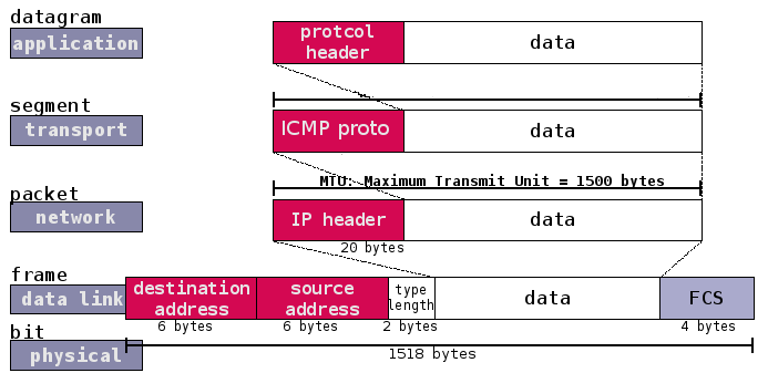 Voici un schéma montrant une encapsulation dans ICMP de paquets IP :