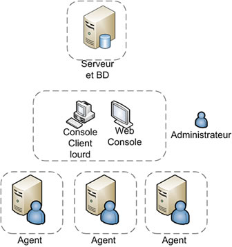 Le second niveau correspond aux consoles. On distingue deux types de consoles. La première est dédiée à la configuration (console d'administration) et la deuxième à l'exploitation (console d'opération). La console d'administration permet aux administrateurs d'accéder aux informations stockées au niveau du serveur et de sa base de données. La console d'opération permet quant à elle, de visualiser l'état de santé du SI, car c'est via cette interface graphique que l'exploitant va pouvoir être alerté de l'apparition d'un incident. Enfin, MOM propose un accès au serveur via une console web, qui n'autorise que la visualisation de l'état du parc.