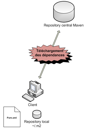 Par défaut, Maven télécharge les librairies/dépendances sur les repositories officiels Maven (par exemple http://repo1.maven.org/maven2. Les dépendances à télécharger sont précisées dans le fichier pom.xml du projet. Les dépendances téléchargées sont stockées dans le répertoire ~/.m2/repository du poste client :