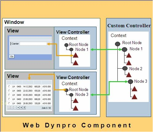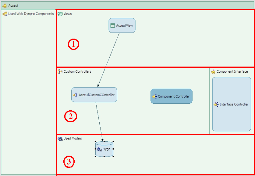 Notons que le rôle du modèle (encadré n°3) est bien différent de celui du design pattern MVC. En effet le modèle du framework WebDyn Pro sert uniquement à importer les données système du progiciel SAP (retour des programmes ABAP). Il n'est donc pas obligatoire pour faire fonctionner une vue dont les données système sont inutiles.