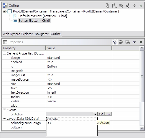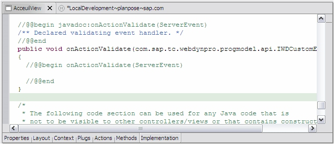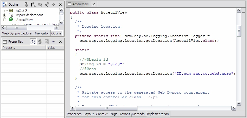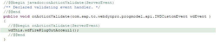 - Et enfin la méthode wdDoModifyView, qui est la plus importante, est éxécutée à chaque réaffichage de la vue. C'est la seule méthode ou les objets de la vue sont accessibles grace à l'argument "com.sap.tc.webdynpro.progmodel.api.IWDView view" que possède cette méthode. Pour récupérer un Objet il suffit de faire "view.getElement("IDElement"). On peut ensuite travailler sur l'objet comme par exemple lui indiquer ces propriétés.
