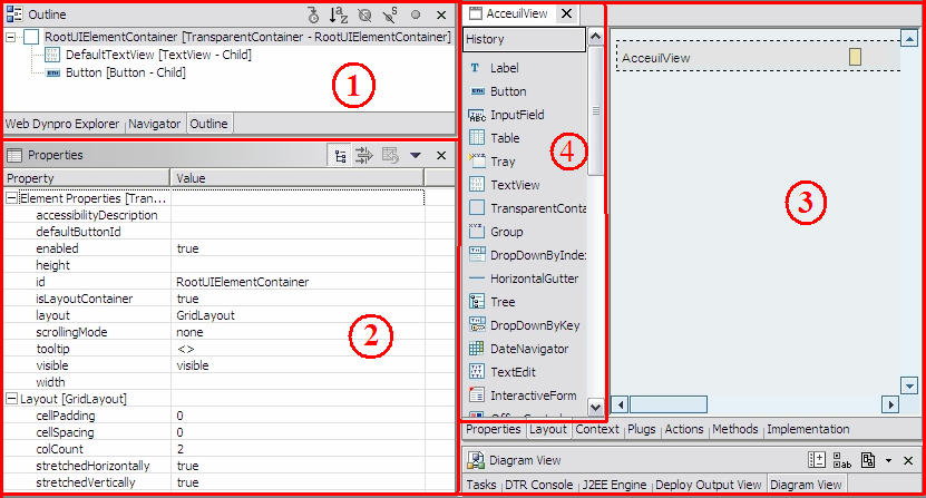 Les encadrés n°3 et 4 representent l'onglet "Layout" de la vue. Les utilités des autres onglets seront expliquées ultèrieurement comme l'onglet "Implementation" dans la section Développement dynamique