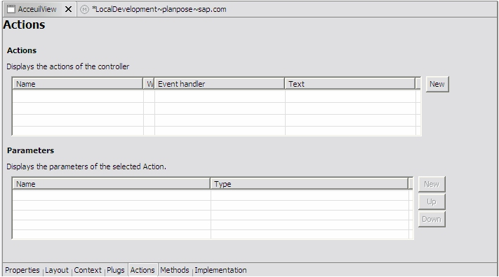 Pour déclarer une action il suffit d'aller dans l'onglet "Actions" de la vue (comme la capture ci-dessous) et de cliquer sur le bouton "New".