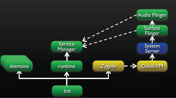 - Pré charge les classes et écoute sur une socket pour créer des Dalvik VM