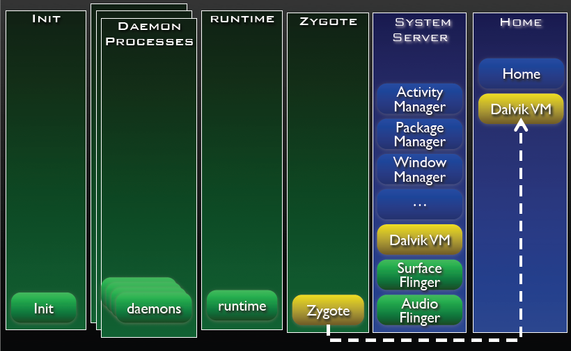 - Fork sur demande pour créer des instances de Dalvik VM pour chaque application