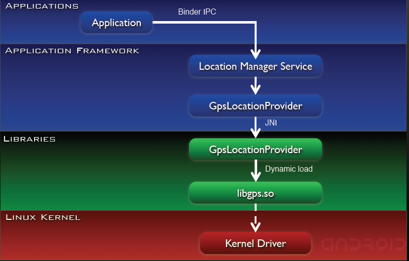 L'application utilisateur récupère Location Manager Service en utilisant le Context Manager. Ensuite le Location Manager interroge le GpsLocationProvider qui lui même interroge en utilisant JNI (Java Native Interface) la librairie C/C++ GpsLocationProvider qui va charger la librairie dynamique libgps.so.