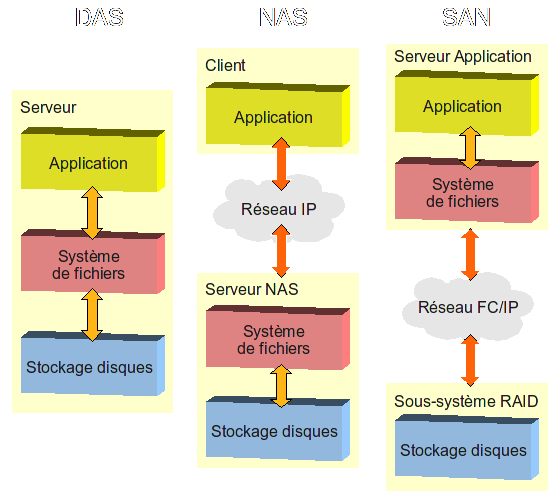 Ce schéma compare de manière simplifié les architecture du NAS, d'un SAN, et d'un DAS.Le DAS (pour Direct Attached Storage), qui n'a pas fait l'étude d'une présentation ici, est en fait un périphérique de stockage en attachement direct tels qu'on pouvait le concevoir auparavant assez simplement. Il n'est donc accessible qu'aux ordinateurs auxquels il est raccordé, le plus souvent en protocole SCSI.