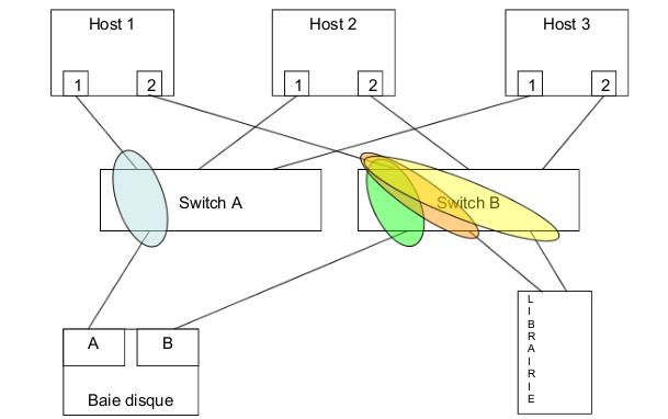 Le schéma ci-dessous présente un réseau SAN "typique". On notera ainsi la redondance des équipements réseaux et des liens, qui permettra de poursuivre l'exploitation en cas de défaillance d'un équipement.