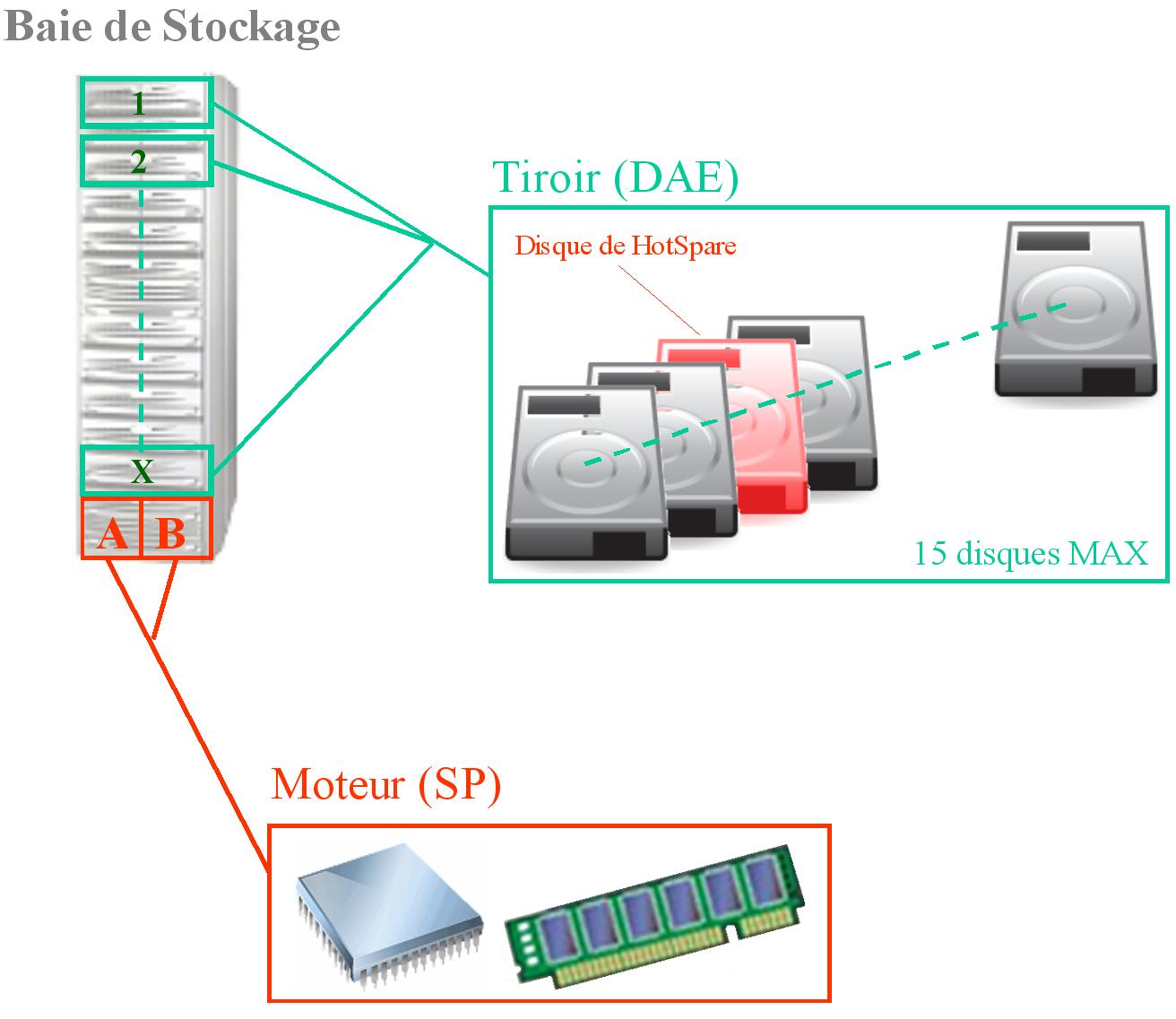 - plusieurs tiroirs de disques (ou DAE), ceux-ci sont généralement composés de 15 disques au maximum ;