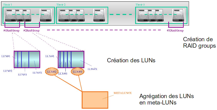 Ces groupes sont ensuite divisés en unités de stockage logiques appelées LUNs. Enfin, ces LUNs sont agrégés en meta-LUNs. L'idée de ce découpage est de permettre de partager la charge de travail sur plusieurs LUNs et sur plusieurs groupes RAID.