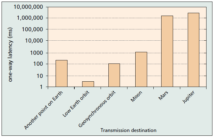 Dans l'espace, les distances peuvent être très importantes. Pour parcourir ces distances, les données sont limitées par la vitesse de la lumière qui, si elle parait instantanée sur Terre, se révèle "lente" dans le cadre des communications interplanétaires :