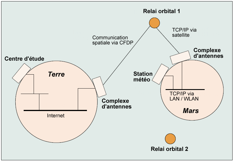 Le scénario est simple : une station situé sur Mars veut transmettre les résultats de ses recherches à un centre sur Terre. Les communications vont emprunter, dans l'ordre :