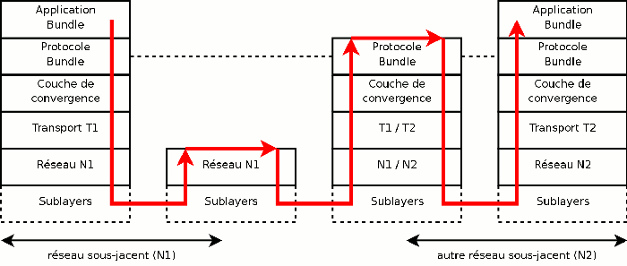 Pour mettre en place le Store-and-forward message switching, une nouvelle couche réseau a été mise en place : la couche Bundle. Elle vient se placer entre la couche application et les couches spécifiques aux réseaux (Transport, Réseau, etc.). Elle permet donc de s'abstraire des technologies rencontrées sur les différent réseaux du DTN. Une couche intermédiaire appelée Convergence Layer, est utilisée pour faire le lien entre la couche Bundle et les couches inférieures.