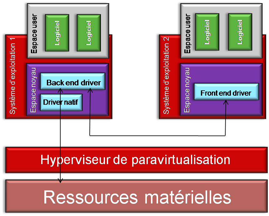 En fait, ce qu'il se passe dans une telle technologie, c'est que le contrôle d'un ou plusieur matériel(s) est donné à un des OS virtualisé (celui qui contient le driver backend), ici le système d'exploitation 1. Une fois celà compris, il sera simple d'imaginer que l'OS 2, qui souhaite accéder au harware, devra passé par son driver front end qui redirigera les appels système vers l'OS 1. L'inconvénient de cette technique est donc la dépendance d'un OS virtualisé vis à vis d'un autre qui se créé par ce mécanisme de driver. En effet si l'OS 1 tombe en panne, l'OS 2 ne pourra plus accéder au matériel.