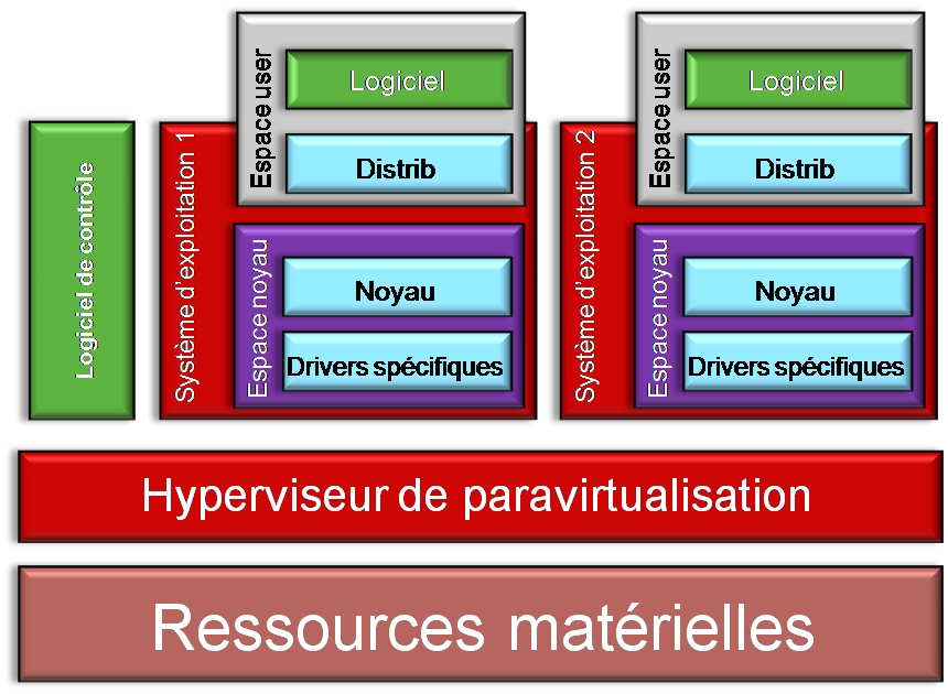 Par opposition à la virtualisation, on parle de paravirtualisation lorsque les systèmes d'exploitation doivent être modifiés pour fonctionner sur un hyperviseur de paravirtualisation. Les modifications sont en fait des insertions de drivers permettant de rediriger les appels système au lieu de les traduire.