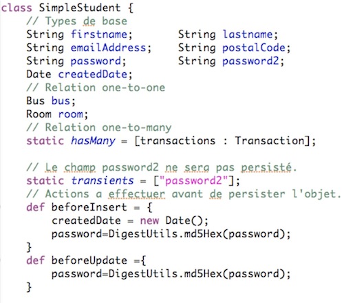 Cette commande est la première que l'on tape lorsque l'on crée notre application. Elle permet de créer tous les dossiers de l'application web. - grails create-domain-class my.pckg.DomainClass :