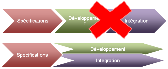 Le but de l'intégration continue est d'effectuer en parallèle les étapes de développement et d'intégration du projet, comme illustré sur le schéma ci-dessous. Le but est d'éliminer au maximum les détections de bug en phase finale du projet. En effet, la phase d'intégration est souvent source d'instabilité et de stress, car en général proche de la date de livraison. Pour un environnement classque (le cas barré d'une croix rouge), les intégrateurs n'ont aucune idée du nombre de bugs qui vont apparaître, et sur la difficulté à les corriger. Une étude a montré de 5% des bugs représentent 95% du temps de débug. Ces derniers sont le plus souvent rencontrés lors de la phase d'intégration. Il peut s'agir d'une erreur de développement, ou pire, une erreur de spécification. L'existence et la validation progressive des tests d'intégration responsabilise les développeurs sur la bonne interaction de leurs modules de développement.