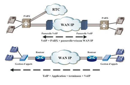 La VOIP représente seulement la technologie de transport de voix sur le protocole Internet. La TOIP, représente la VOIP en addition de toutes les applications téléphoniques qu'il peut y avoir. Le schéma ci-dessous explique cette différence :