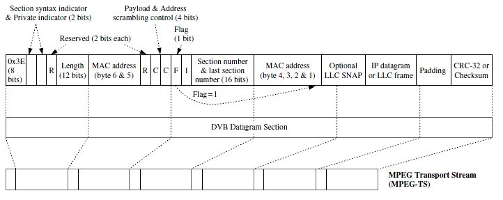 On peut donc au final encapsuler des paquets IP au sein de la couche DSM-CC en les divisant entre plusieurs cellules MPEG-TS si besoin (puisque celles-ci ont une taille fixe de 204 octets).