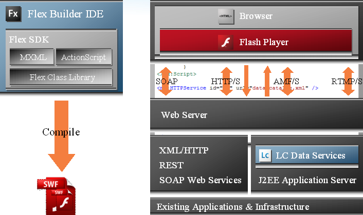 Via le Flex Builder IDE, on crée 2 types de fichiers (AS3 et MXML) qui constitueront l'application et on compile. Le compilateur va alors créer un fichier SWF (lu par le lecteur flash). Le fonctionnement est alors similaire à celui de Silverlight. Le fichier SWF est stocké sur un serveur. Ce fichier sera distribué aux personnes voulant utiliser l'application. Ainsi, le fichier SWF sera lu côté client à l'aide du plugin flash du navigateur de son choix. Et enfin, par échange SOAP, HTTP/S, RTMP/S ou encore AMF/S, les données sont échangées avec le serveur pour toute récupération de données.
