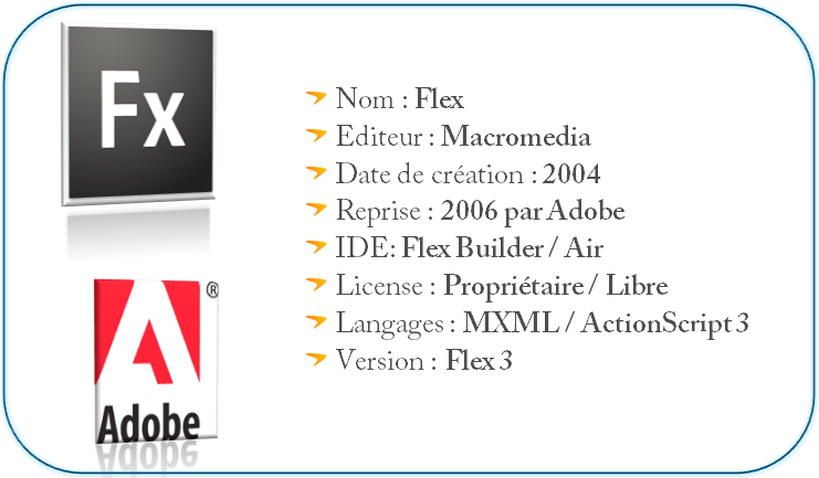 Flex est un framework Open Source gratuit qui permet de créer des applications web ultra-interactives et expressives se déployant de manière identique sur la plupart des navigateurs, postes de travail et systèmes d'exploitation. Il est apparu en 2004 et a ensuite été repris par Adobe en 2006. Flex utilise Flex Builder / Air pour ce qui est du développement de l'application et est sous licence propriétaire / libre. Il offre un modèle de programmation évolué qui repose sur des langages standard et gère les modèles de conception courants. MXML, langage déclaratif basé sur XML, sert à décrire l'agencement et le comportement de l'interface utilisateur tandis que le langage de programmation orienté objet ActionScript® 3.0 est employé pour la création de fonctions de traitement côté client. La dernière version stable est la 3 et une bêta est en cours (version 4).