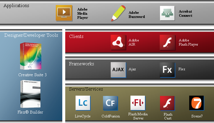 - Couche "Designer/Développeur" : On a la Creative Suite pour ce qui est de la description graphique et Flex Builder pour ce qui est de la logique métier ;