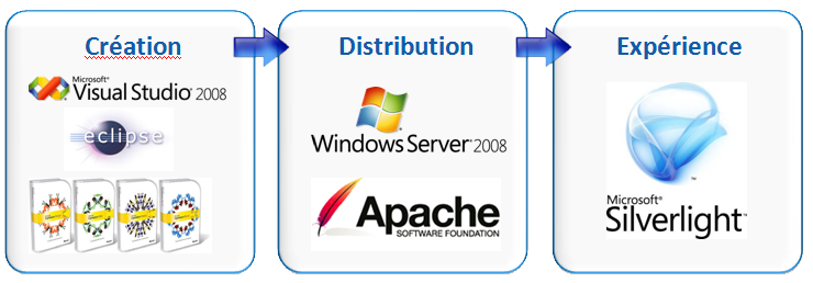 - Distribution : Cette phase concerne la moyen de fournir l'application aux utilisateurs voulant l'utiliser. Il est ici possible d'utiliser n'importe quel type de serveur tel que Windows Server, Apache ou bien Tomcat, etc. En effet, il est important de savoir que l'application Silverlight n'est non pas hébergé sur un serveur mais distribuer par le serveur. En effet, l'application ne tourne pas sur le serveur mais sur le poste client ce qui a pour avantage un gain de rapidité (moins d'aller-retour serveur) ainsi qu'un gain de maintenabilité (pas besoin de gérer le serveur) ;