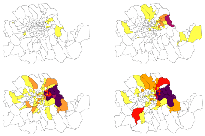 semaine une carte des densités des cas de choléra qu'il a recensé dans