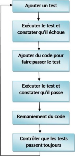 Le cycle de développement préconisé par TDD comporte cinq étapes :- Ecriture d'un premier test