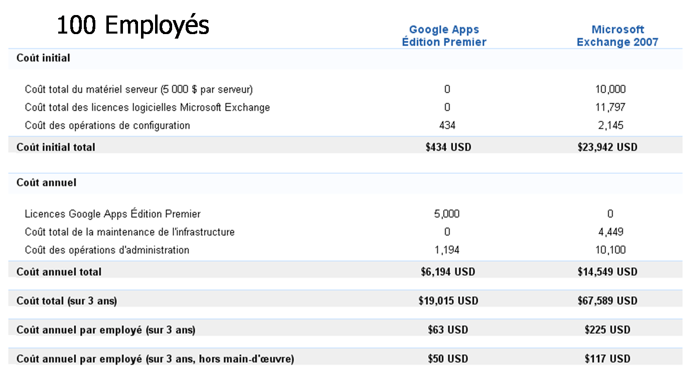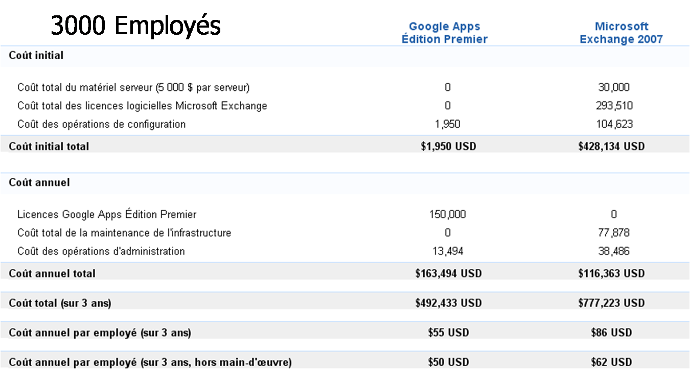 Lors de la comparaison entre "Google Apps" et "Exchange Online" il peut être remarqué que "Google Apps" est facturé 60 euros par an alors que "Exchange Online" est facturé 120 euros par an.
