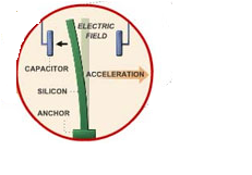Lorsque la lamelle de silicon reçoit une accélération ( une force ( enfin quand elle bouge ;) ) ), elle modifie le champs électrique.