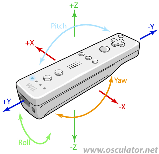 En effet, selon dans quelle sens est penchée la wiimote, il y aura plus ou moins de force sur l’axe X, Y et Z De ce fait, on va pouvoir utiliser les informations venant de l’accéléromètre pour faire le travail du gyroscope. Néanmoins, le calcul est moins précis qu’un vrai gyroscope et c’est surement pour cela que Nintendo s’est finalement rabattu sur un gyroscope ( WII motion Plus ) ( ou pour faire des sous ;) mais ne soyons pas médisant ).