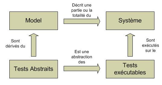 Le modèle décrit la totalité ou une partie du système. A partir du modèle sont dérivés les tests abstraits qui sont la base des tests exécutables qui vont tester la boîte noire, nommée système. Les tests abstraits sont comme le modèle, indépendants de la plate-forme utilisée. Ils sont une interface commune aux tests exécutables qui seront générés; ils représentent un cheminement dans l'utilisation du système.