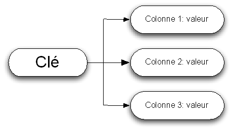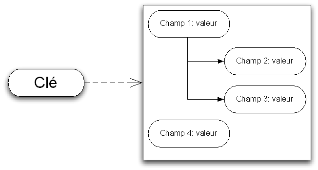 La représentation en clé-valeur est la plus simple et est très adaptée aux caches ou aux accès rapides aux informations. Cette représentation permet en général d’atteindre des performances bien supérieures dans la mesure où les lectures et écritures sont réduites à un accès disque simple. On trouve 3 différentes implémentations: Riak, Redis et Voldemort.