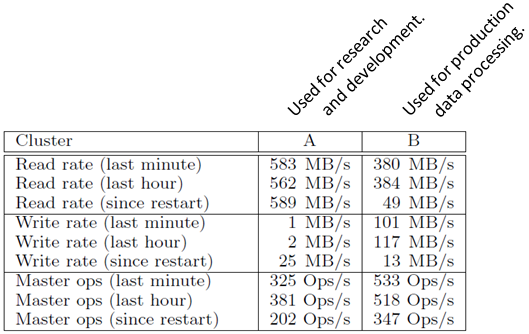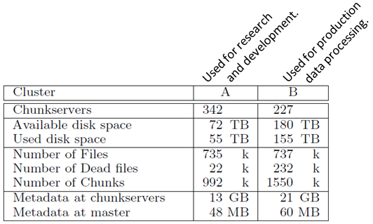 Sur les deux clusters, nous pouvons constater des centaines de Chunks Servers. Actuellement, un cluster GFS contient plusieurs milliers de Chunks Servers.