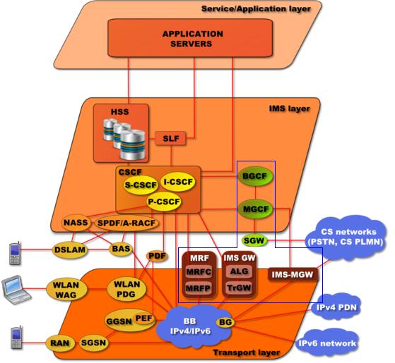 Interfonctionnement du SIP avec la signalisation dans le RTC, et la commutation de circuits à base de paquets RTP, est réalisé en utilisant la SGW et les fonctions MGW. Le MGCF contrôle le flux provenant des MGWs. Le transport de la signalisation entre la MGCF et la SGW est réalisée en utilisant SCTP (Signaling Control Transport Protocol). Une BGCF (Border Gateway Control Function) indique si une session se termine sur le RTC et détermine quelle MGCF devrait la traiter.