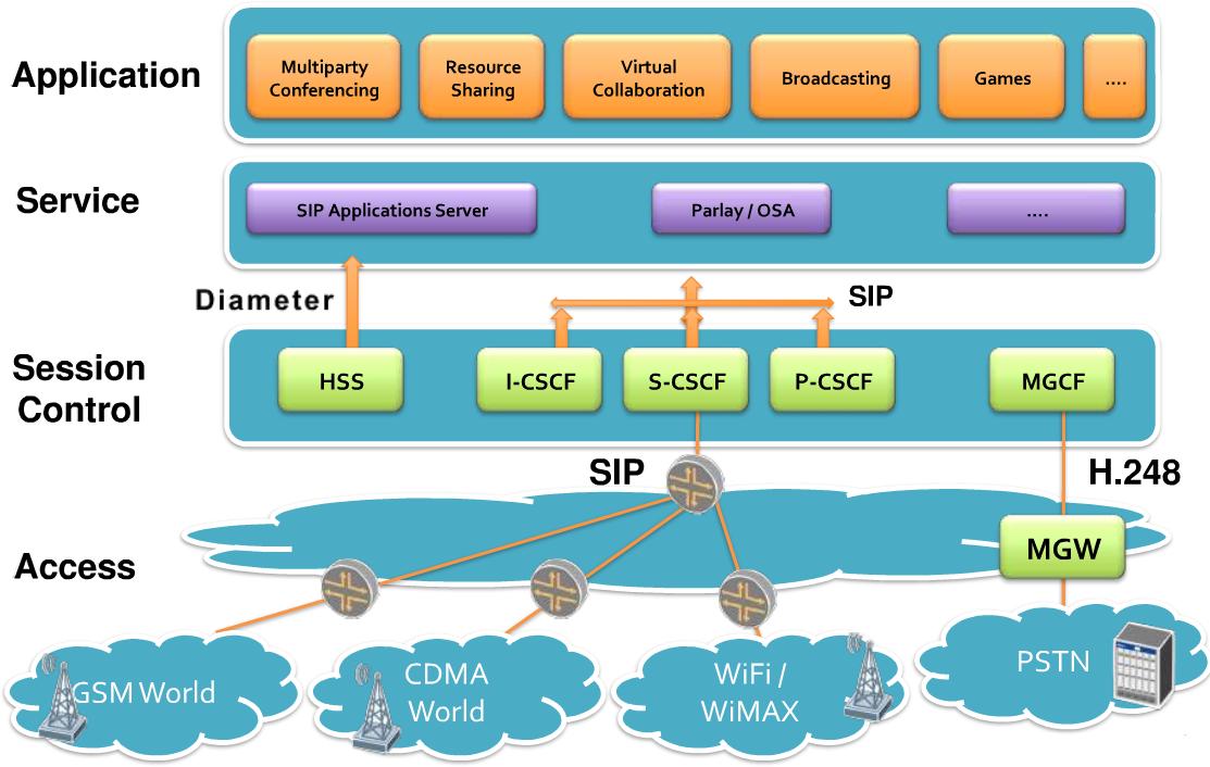 - La couche "Application" fourni l'ensemble des applications disponibles dans une architecture IMS telle que la présence, la visio-conférence, etc.