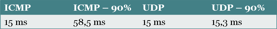 Nous avons vu précedemment qu'il y a deux façon d'obtenir des informations concernant l'état du réseau (gigue, paquets perdus et latence) : soit en UDP soit en ICMP. En UDP, le calcul se fait avec RTT tandis qu'en ICMP il n'y a qu'un seul timestamp et voici les écarts que l'on peut constater si l'on demande le temps d'aller-retour sur un routeur chargé à 90% :