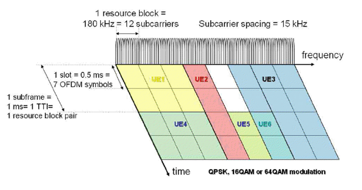 Ce schéma montre comment LTE répartie les ressources disponibles entre les différents utilisateurs.