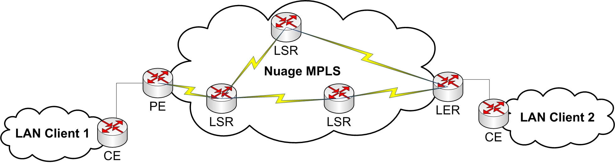 Divers équipements rentrent en jeu dans la mise en place d'un réseau MPLS :- CE : Customer Edge => routeur client